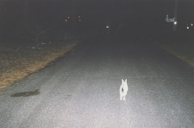 | Also, she's impossibly slow! See Mark's flashlight way up the road, and how far behind Lily is! I have to keep looking back to make sure she's okay, and that is quite a distraction I don't really need. |